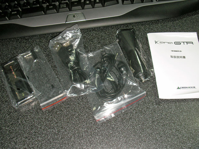 左から本体、トランスミッター用のアンテナ、USBの延長ケーブル、カナル型イヤホン、カーシガレットUSBアダプタ