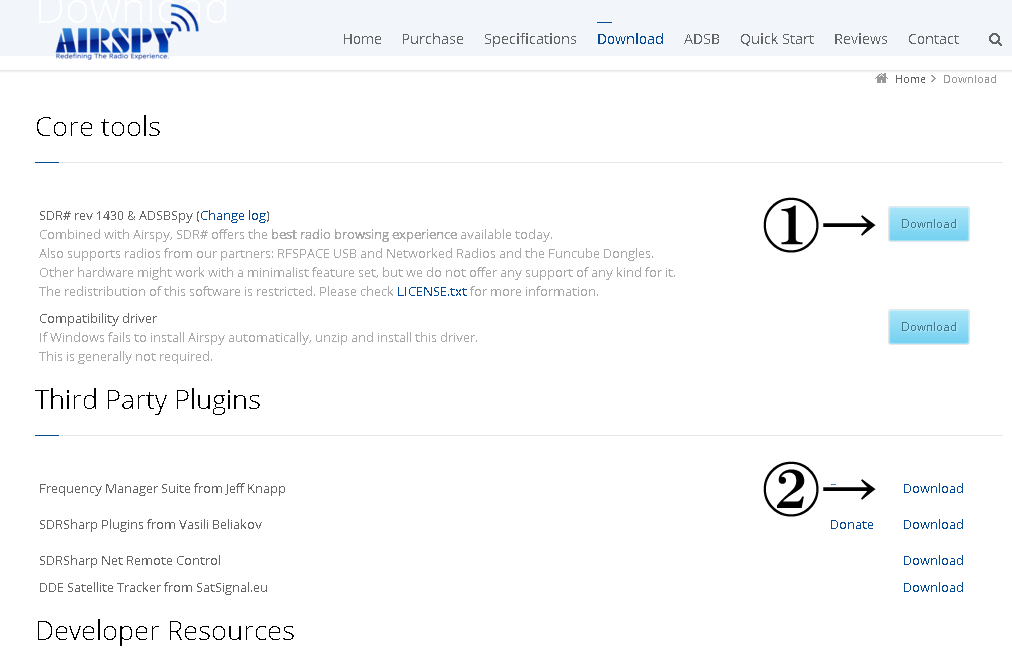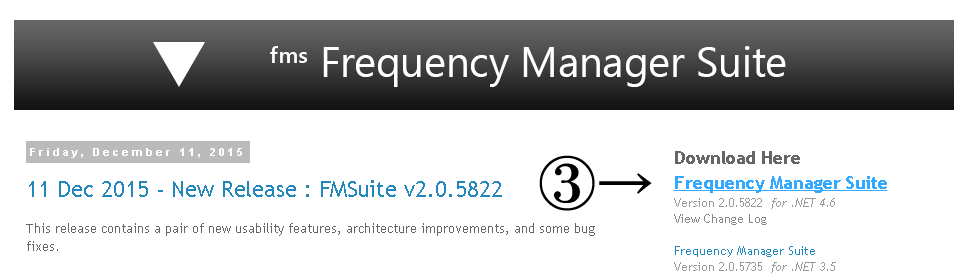 まず上記SDR#のダウンロードと同じページにアクセスし、矢印②のDownloadをクリック、移動先のページ矢印③のFrequency Manager Suiteをクリックしダウンロードします。