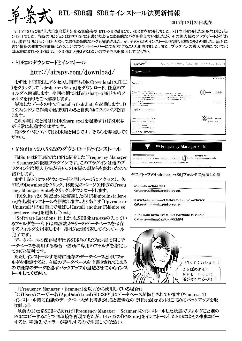 2015年8月に発行した「摩耶様と始める無線傍受 RTL-SDR編」にて、SDR#を紹介しました。8月当時紹介したSDR#はリビジョン1361でした。当時のリビジョンは作中12Pにも書いたように致命的なバグを抱えていましたが、その後大幅なアップデートが行われ、現在はリビジョン1430となっており致命的なバグも解消された。が、その代わりインストール方法も大幅に変わりました。流石に古い情報のままでの頒布は心苦しいので今回ペーパーにて配布することと相成りました。また、プラグインの導入方法については基本的にRTL-SDR編(以下SDR編)と変わりはないのでそちらを参照してください。