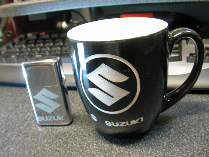 そんな訳で今回のサンドブラストはスズキのロゴをコーヒーカップに彫り込んでやろうと思います。